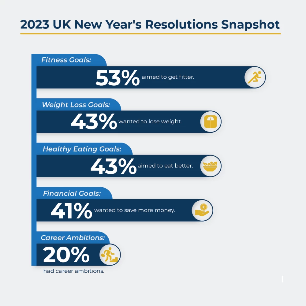In the UK in 2023, many people made New Year’s resolutions. [1] 53% wanted to get fitter, 43% wanted to lose weight and 43% aimed to eat better. Moreover, 41% of people wanted to save more money and 20% had career ambitions.